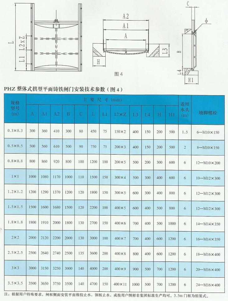 PHZ整體式拱型平面鑄鐵閘門安裝技術參數(shù)